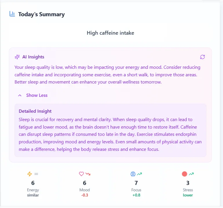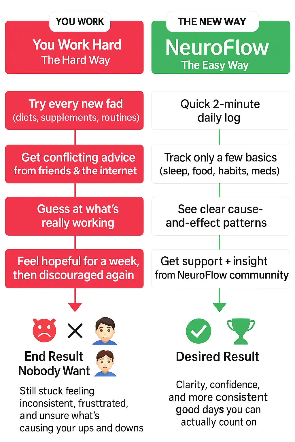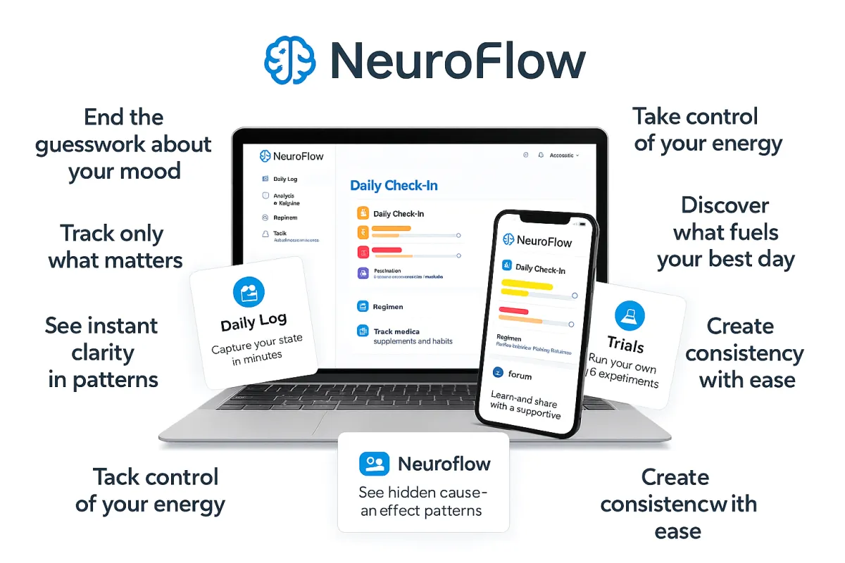 Most apps stop at mood tracking—they let you log how you feel, but they don’t reveal what’s causing it. NeuroFlow connects your daily inputs (like sleep, food, supplements, and habits) directly to your mood and energy, so you finally see the hidden patterns.